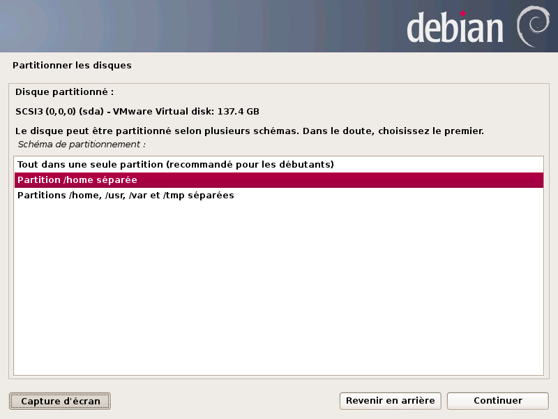 Partitionner les disques : On choisit Partition /home séparée puis cliquez sur Continuer